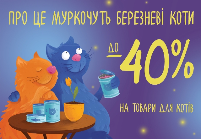 | Описание акции: | Про це муркочуть березневі коти З 2 по 15 березня 2017 року в супермаркетах «Сільпо» на всі товари для котів діють знижки до 40%! ![]() Обирайте разом улюблене меню, засоби догляду та гігієни, а також товари для комфорту вашого котика, виділені спеціальними цінниками «Березневі коти». Акція діє в супермаркетах «Сільпо» згідно з адресною програмою за умови наявності в асортименті акційного товару. Запас товару обмежений. Адреси магазинів та список акційних товарів можна знайти за посиланням. | ||||||