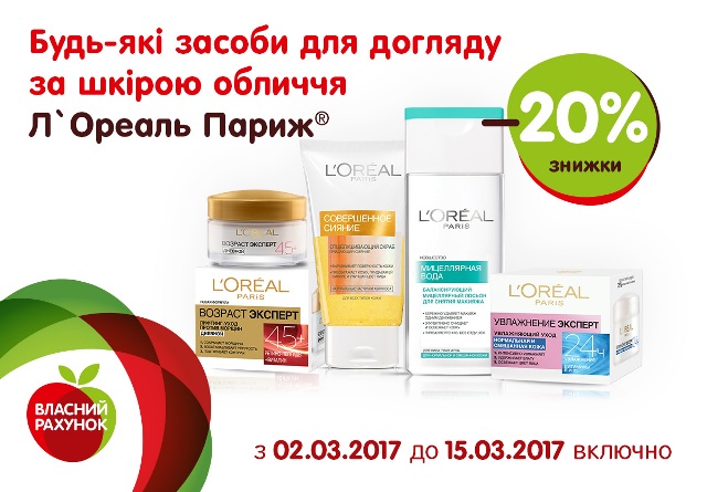 | Описание акции: | Купуйте будь-які засоби для догляду за шкірою обличчя L’Oreal® зі знижкою 20%!![]() З 2 до 15 березня 2017 року включно в супермаркетах «Сільпо» діє акція на будь-які засоби для догляду за шкірою обличчя L’Oreal ® – 20% знижки на кожну одиницю акційної продукції у чеку. Акція діє для всіх учасників програми «Власний Рахунок» за умови пред’явлення на касі картки або брелока програми. Знижка нараховується на касі автоматично при кожній купівлі акційної продукції. | ||||||