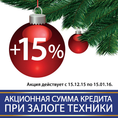 C 15.12.2015 и до 15.01.2016 г. проходит акция по технике, условия простые: при залоге любой техники на любой срок – сумма кредита увеличивается на 15%. Акционные условия действуют только при операции «залог» для всех тарифных пакетов (максимальный, оптимальный, экономный).