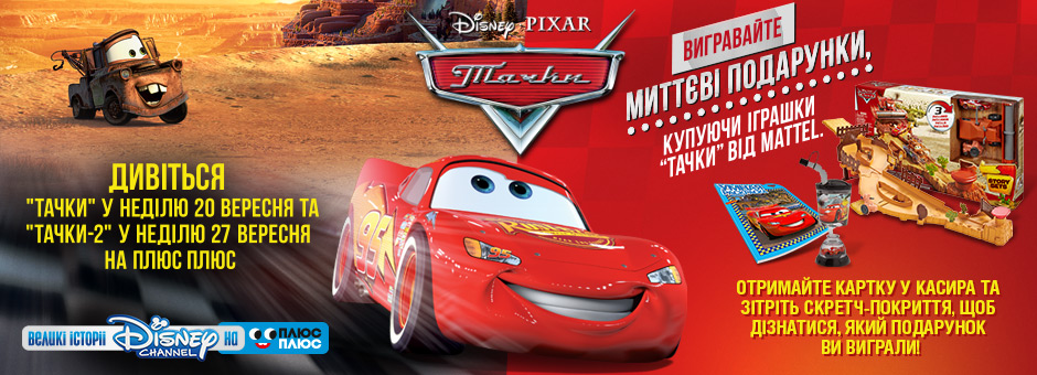 Описание акции: | Пориньте у Світ Тачок! Тільки з 12 вересня до 11 жовтня купуйте будь-яку іграшку «Тачки» від Mattel та отримуйте неймовірні подарунки*!