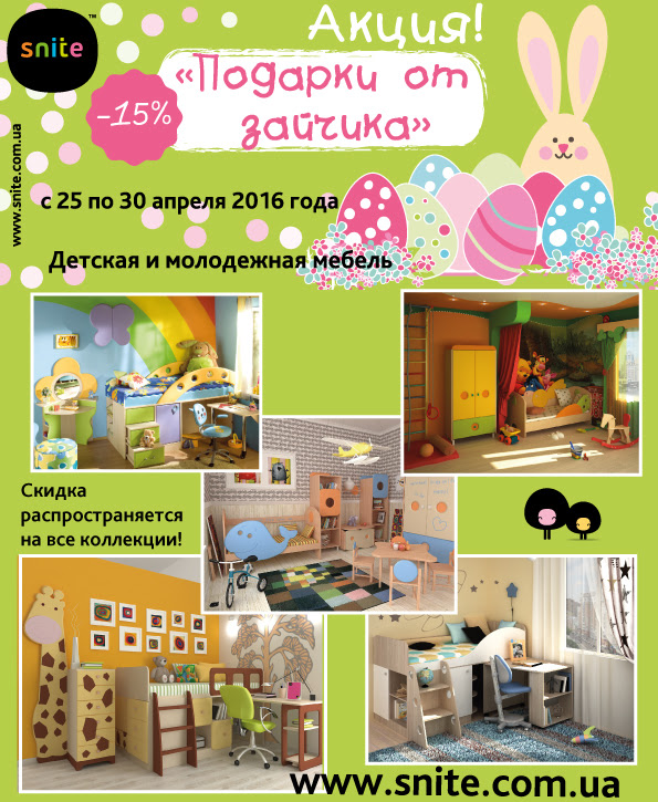 Описание акции: | В салонах СНАЙТ в Киеве, а также нашем интернет магазине, все коллекции можно приобрести с 15% скидкой! Подарки от зайчиков ждут Вас!![]() | ||||||