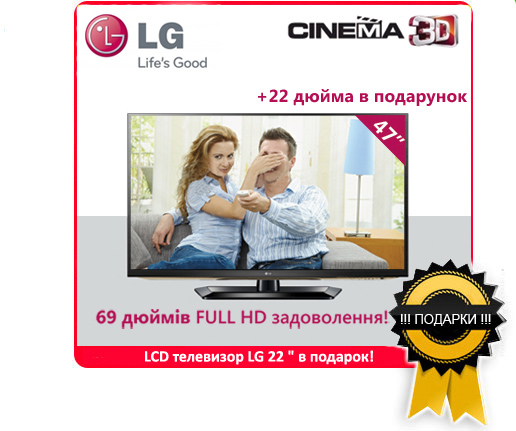 Описание акции: | Акция! 69 дюймов FULL HD удовольствия! Каждый покупатель акционного LCD телевизор LG 47 " 47LM580T получает в подарок LCD телевизор LG 22 " M2250D-PZ! ![]() | ||||||