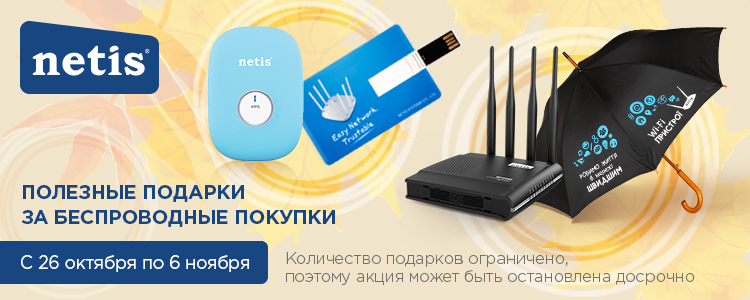 *К беспроводным адаптерам netis в подарок идет USB-накопитель, а к маршрутизаторам в подарок зонт.