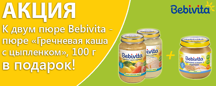 При покупке двух пюре Bebivita — пюре "Гречневая каша с цыпленком" в подарок!