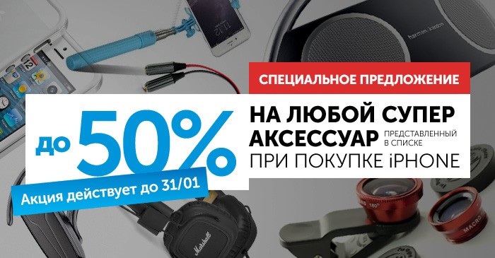 Теперь при покупке iPhone вы можете укомплектовать его всем необходимым. Мы составили список наиболее популярных товаров, которые вам могут понадобится: защитные пленки, различные чехлы, внешние аккумуляторы, колонки, наушники и моноподы. И все эти товары (внимание!) со скидкой до 50%!