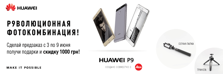 Описание акции: | В период с 3 июня по 9 июня 2016 года каждый кто сделает предзаказ на модели Huawei P9 Prestige Gold, Huawei P9 Mystic Silver, Huawei P9 Titanium Grey гарантировано получает в подарок треногу, селфи-палку и скидку 1000 грн!![]() | |