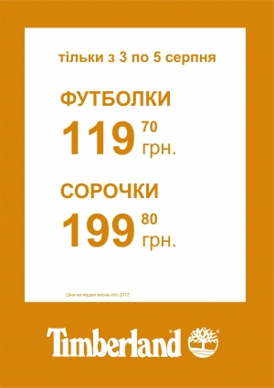 Описание акции: | Только в этот уикенд рубашки и футболки лучшего outdoor бренда TIMBERLAND представлены по специальным ценам! В период с 3 по 5 августа приглашаем вас в магазины TIMBERLAND приобрести рубашки и футболки из коллекции весна-лето 12! * Выше указанные цены, не распространяются на товар, цена которого ниже акционной. ![]() | ||||||