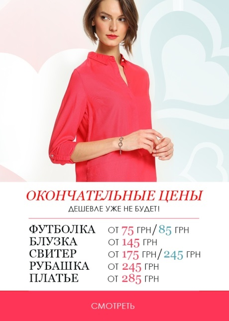 И сегодня не исключение! В каждой из наиболее популярных категорий одежды мы предлагаем вам несколько товаров с макисмально приятной ценой! Например, женские и мужские футболки за 75грн и 85 грн, блузки за 145 грн, рубашки за 195 грн.