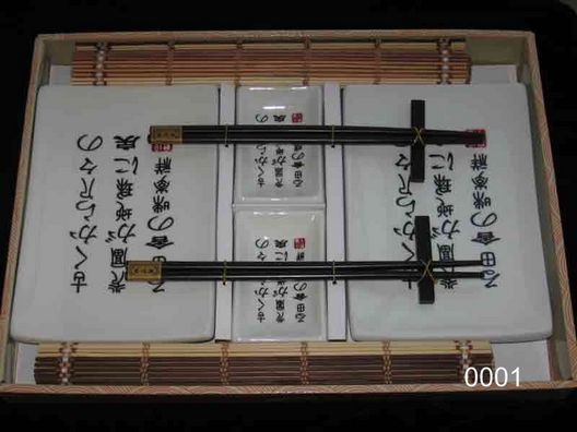 Комплектация набора: 10 предметов - 2 большие тарелки, 2 маленькие тарелки, 2 набора палочек, 2 подставки под палочки, 2 бамбуковые салфетки.Упаковка: Картонная коробка. Материал: керамика (посуда, подставки под палочки), дерево (палочки),бамбуковые салфетки. Новая цена: 164,25 грн ![]() | ||||||