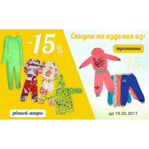 | Описание акции: | Скидки на детскую одежду из трехнитки и рваной махры![]() Наши любимые и дорогие клиенты! Интернет-магазин «Виса» проводит новую распродажу и предлагает скидки на детскую одежду из трехнитки и рваной махры. Мы любим своих клиентов, и стараемся их радовать самыми интересными предложениями и только выгодными условиями сотрудничества. Теперь, независимо от суммы и размера заказа, каждый клиент получит приятную скидку в 15% на все изделия из трехнитки и рваной махры. Каждая опытная мама знает, что выбрав хороший интернет магазин детской одежды скидки, можно пополнить гардероб своего маленького модника или модницы новыми качественными и стильными вещами. Ведь не только взрослые, но и дети желают выглядеть красиво и модно! Детская одежда со скидкой интернет магазин «Виса» – качественные и стильные вещи оптом и в розницу по самым приятным ценам. Так, мамы и папы могут совершенно недорого купить детский халат с капюшоном для мальчика и для девочки, теплые пижамы для детей и не только. Мы также предлагаем Вам обратить внимание на взрослые женские пижамы. Кроме того, наш интернет магазин детской одежды распродажа – это отличная возможность для тех, кто уже давно хочет приобрести своему чаду удобные детские спортивные костюмы недорого. Внимание! Скидки в 15% на все изделия из трехнитки и рваной махры действуют до 10.02.2017. Поспешите воспользоваться приятными скидками и выгодно купить комсомольский трикотаж недорого от производителя «Виса» для себя и своей крохи! | ||||||