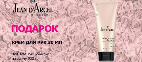 Описание акции: | ![]() В ПОДАРОК Крем для рук 30мл из новой линии VENUSTE от Jean d'Arcel! Профессиональная косметика для домашнего применения Jean d'Arcel (Жан дАрсель, Германия) в качестве сырья использует исключительно натуральные, экологически чистые ингредиенты. Каждый продукт косметической линейки решает проблему кожи или возрастных изменений минимум за счет 4-х активных компонентов! При покупке косметики Jean d'Arcel (Жан дАрсель) от 900 грн. в ПОДАРОК Крем для рук 30мл из новой линии VENUSTE! | ||||||