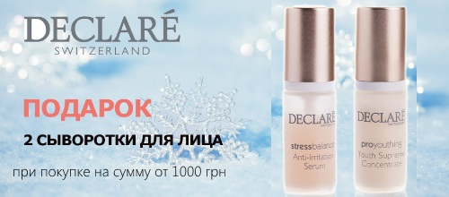| Описание акции: |  В подарок две сыворотки для лица от DECLARE (Швейцария) Ваша кожа склонна к раздражению? Вам тяжело выбрать средства по уходу за ней? Тогда торговая марка Declare - ваш выбор. Используя косметику Declare, вы гарантируете своей коже нежный уход и видимый результат от употребления. Залог качества всей продукции компании Declare - безукоризненная репутация в течение более чем 40 лет. Покупая косметику торговой марки Declare, вы поручаете уход за своей кожей надежным рукам, поскольку со дня основания компания имеет девиз: "Beauty for sensitive skin". в ПОДАРОК две сыворотки для лица при покупке косметики Declare (Дэкляре) на сумму от 1000 грн*! | ||||||