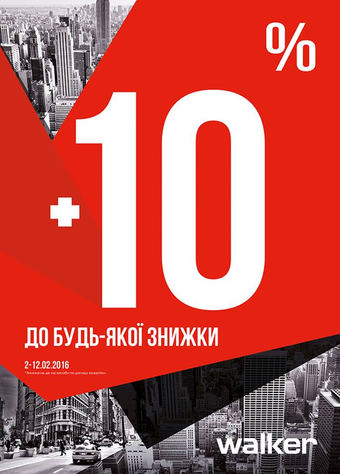 Описание акции: | Атракціон небаченої щедрості від WALKER! Тільки з 2 по 12 лютого WALKER дарує додаткові 10% знижки на будь-який товар з розпродажу! Не пропустіть свій шанс!![]() | ||||||
