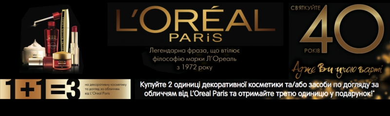 Описание акции: | Купуйте 2 одиниці декоративної косметики та/або засоби по догляду за обличчям від Loreal Paris та отримайте третю одиницю у ПОДАРУНОК*! *мається на увазі придбання товару меншої вартості з трьох за 0.01 грн з ПДВ за умови купівлі одним чеком. Подарунок необхідно взяти з полиці перед здійсненням покупки. ![]() | ||||||