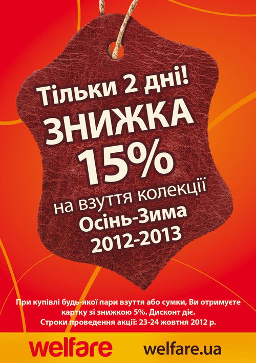 Описание акции: | Акція! Тільки два дні! 23-24 жовтня Знижка 15%+ Дисконт ** - у магазині Welfare! ** Полученная в подарок карточка с 5% скидкой активизируется только при накоплении на данной карточке суммы согласно условиям действующей дисконтной программы в сети магазинов Welfare! ![]() | ||||||