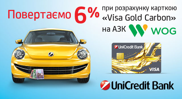 UniCredit Bank спільно з мережею АЗК WOG продовжили та оновили акцію до 31 грудня 2016 року для власників паливних карток Visa Gold Carbon. Починаючи з 01.01.2016 клієнт зможе повернути 6% від суми кожного чеку на пальне.
