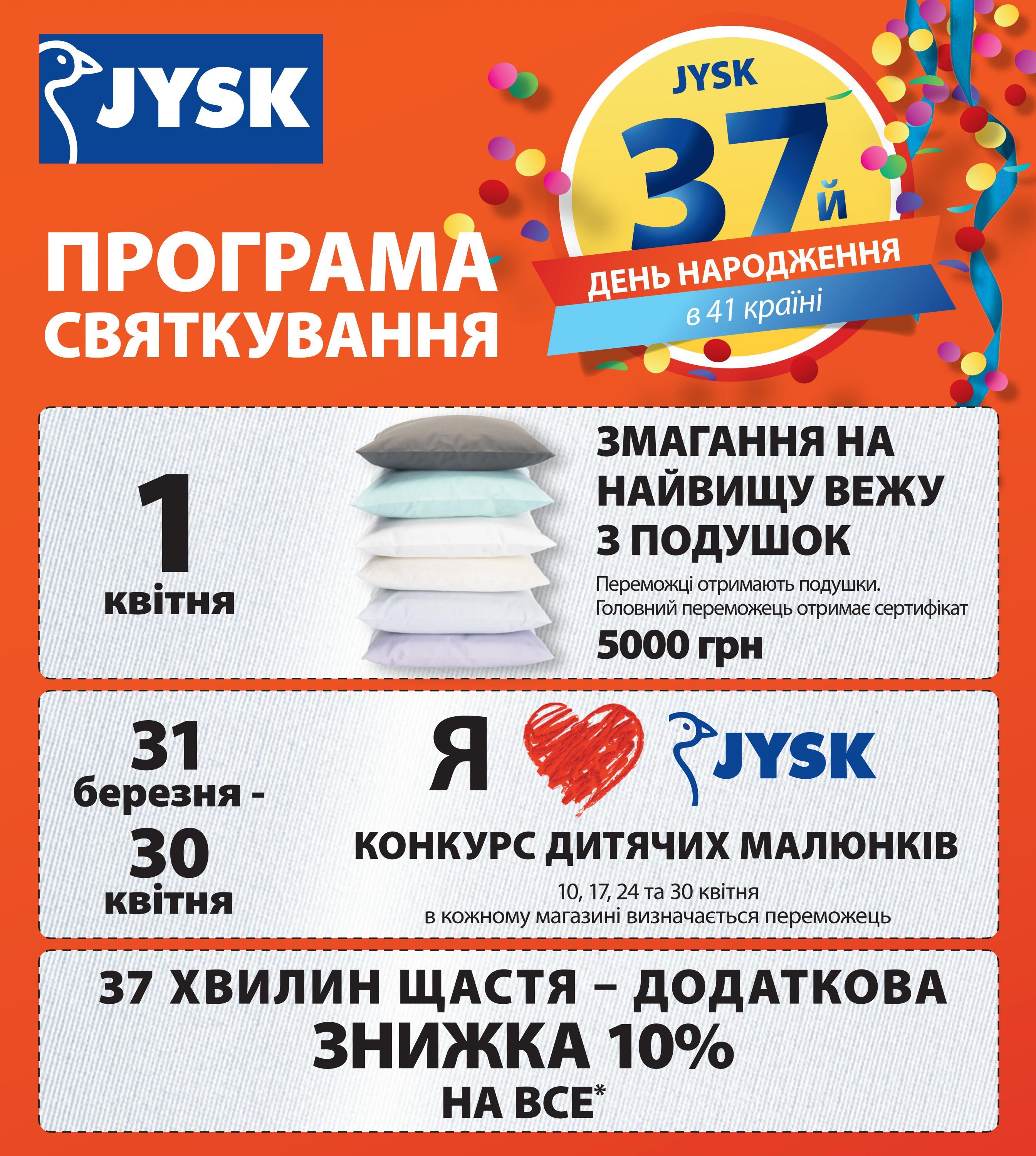Описание акции: | З 31.03.2016 до 30.04.2016 у нас проходить JYSK Вікторина - щодня відповідайте на нове запитання та в кінці отримуйте сертифікат на 5 000 грн. для покупок в улюбленому магазині JYSK!![]() | ||||||