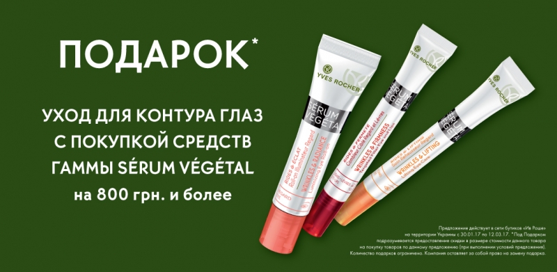 | Описание акции: | ![]() Скидки до -25% на всю гамму Серум Вежетальв магазине Yves Rocher! В подарок уход для глаз Серум Вежеталь при покупке средств гаммы Серум Вежеталь на 800 грн. и более. Магазин Yves Rocher ТРЦ Dream Town 1 (1 этаж, атриум Греция) Скидка действует по 12.03.17 | ||||||