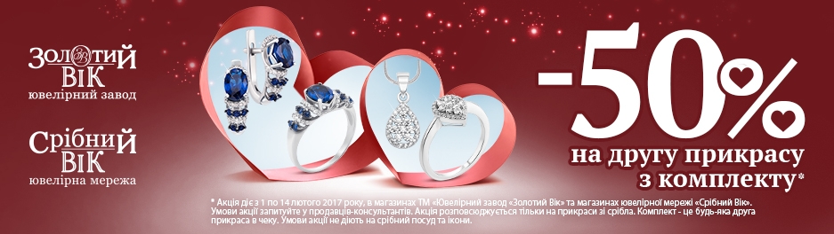 | Описание акции: | ![]() Условия акции предусматривают скидку -50% на второе украшение в чеке. Скидка предоставляется на украшение с меньшей ценой. На акционный товар распространяются скидки по дисконтным картам. Под «комплектом» следует понимать любое другое украшение в чеке. Акция распространяется только на украшения из серебра. Условия акции не действуют на серебряную посуду и иконы. Акция действует с 01.02.2017 по 14.02.2017 в магазинах ТМ «Ювелирный завод «Золотой Век» и в сетях магазинов «Серебряный Век», «Центр Ювелир», «Ваша обручка» и в интернет магазинах sribniyvik.ua и zolotiyvik.ua при условии наличия выбранных украшений на одной торговой точке. | ||||||