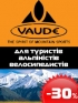 позиций Vaude для туристов, альпинистов и велосипедистов!! Мы уценили все палатки для семейного отдыха, большие трекинговые рюкзаки, как мужские так и женские, и всю коллекцию спальников. Кроме того, скидка в 30% распространяется на бестселлер ультра-лёгких палаток - Hogan Ultralight и рюкзаки для альпинистов Rock Expedition 45+10 и 55+10, а также малые велосипедные рюкзаки! Найдите свой Vaude по специальной цене и только до 1 октября! | ||||||