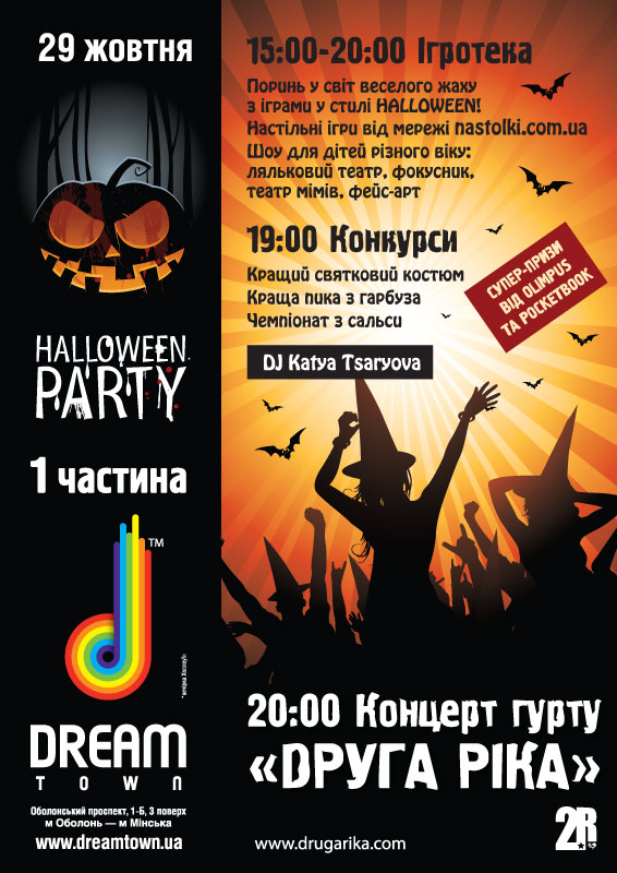 ![]() День 29- го октября в ТРЦ Дрим таун готовит нам много загадочного и от части колдовского. В этот вечерпраздника под названием Halloween Вас ждет много чего ужасающего и интересного! Фишкой нашей праздничной программы будут специально приглашенные гости- группа «Друка ріка»!(сцена находится на 3 этаже начало в 20:00). Атмосфера, которую мы готовим для Вас в этот вечер, будет насыщена потусторонними силами, таинством и мистикой! Повеселиться можно будет от души. Вас ожидает огромное количество конкурсов и подарков: 1. Конкурс на лучший тематический костюм 2. Борьба сумо 3. Чемпионат по сальсе 4. Так же будет проводиться веселый и шокирующий флеш-моб, всех желающих просим зарегистрироваться на сайте под кураторством танцевальных школ. А самое главное наших маленьких гостей ожидает фейерверк эмоций и развлечений. Специальная программа, подразумевает: 1. Выступление мимов 2. Выступление фокусников 3. Конкурс на вырезание самой лучшей хеллоуинской тыквы 4. Настольные игры 5. Детский квест 6. Кукольный спектакль 7. Диско для взрослых и детей 8. Призы предоставлены такими спонсорами как Olympus, Pocketbookи многими другими сюрпризами! Детская программа начнется с 15:00 до 20:00 (3 этаж) Создайте праздник для Ваших детей и всей семьи! Наполните его магией! Разогревать публику будет Dj Katya Tsaryova. Действо проводиться в лучших традициях Halloween! Всех любителей этого праздника приглашаем к нам в гости! Начало в 15:00 29-го октября. ВХОД СВОБОДНЫЙ!!! |