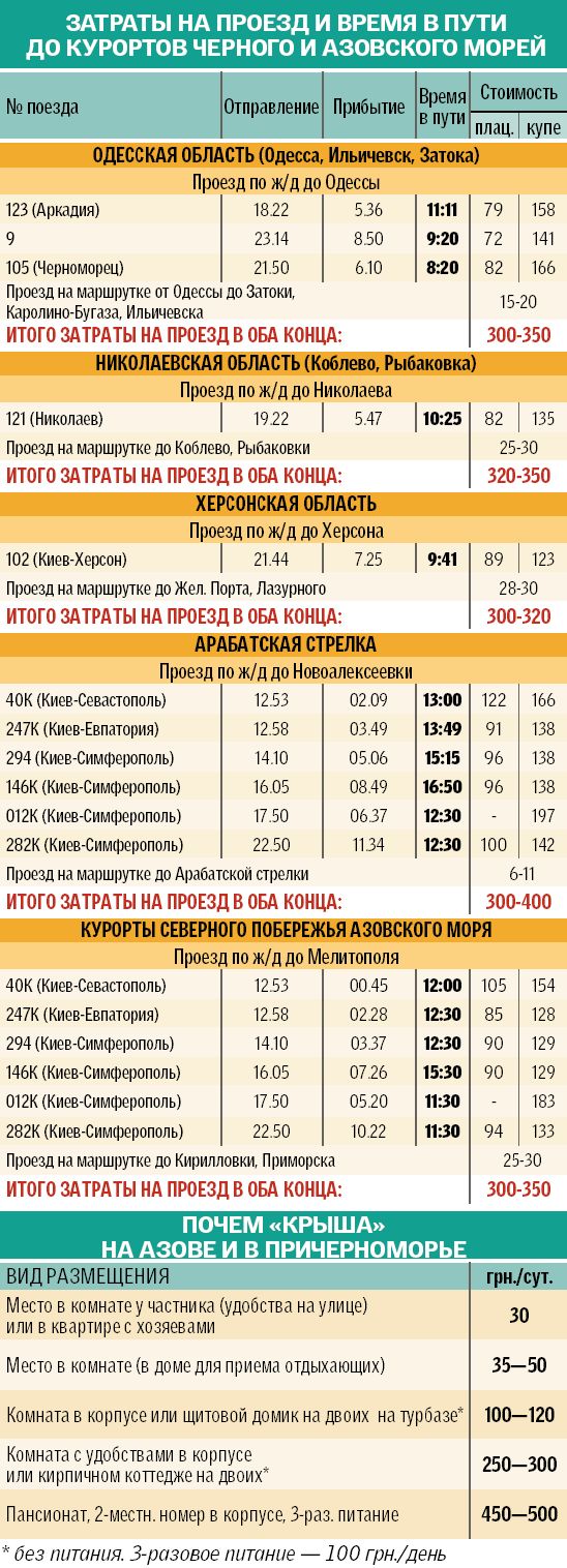 ЦЕНА ВОПРОСА. Проезд до северного побережья Азовского моря получится пусть и незначительно, но дешевле прочих вариантов: около 300 грн. В случае Одессы, Затоки, Коблево, Рыбаковки и Железного порта, стоимость ж/д билетов в пределах 320—340 грн. в оба конца на человека. В среднем же 4 дня на море обойдутся в 1100—1200 грн. (проезд — 350 грн., питание 130 грн./день, проживание — 60 грн./сутки).