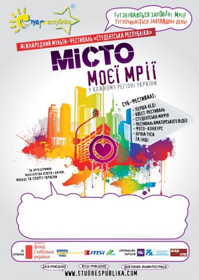 10 и 12 августа в Киеве пройдет региональный этап традиционного ежегодного фестиваля молодежи и студенчества «Студенческая республика». В этом году фестиваль в столице состоится в 14-й раз и пройдет под названием «Город в городе».![]() Мероприятия Фестиваля будут проходить на Трухановом острове, где около 500 жителей республики создадут свои импровизированные студенческие партии. Участники будут иметь собственную игровую валюту, законы, власть и будут реализовывать инфраструктурные проекты. В рамках киевского этапа фестиваля «Студенческая республика» уже традиционно пройдут следующие мероприятия: - Конкурс красоты «Первая леди» - Турниры по играм: «Мафия», «Квест», «Дебаты» - Кубок КВН Студреспублики Киева - Спортивные соревнования (футбол, волейбол, канат, канатная дорожка, байдарки и др.). - Интеллектуальные игры - Конкурс флэш-мобов - Open air «Ночная Туса» - Соревнования по пляжным видам спорта - Фестиваль любительского видео - Фото-конкурс. Победители регионального этапа в Киеве, а также в других городах Украины отправятся на финальную часть мульти-феста в Крым, которая пройдет с 24 по 27 августа в развлекательном комплексе «Солнышко» под Евпаторией. Подробнее |