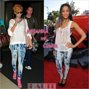 ![]() Ciara надела леггинсы на премьеру фильма в Лос-Анджелесе. Она дополнила образ прозрачной белой майкой и черными туфлями Yves Saint Laurent. Rihanna свои котоновые леггинсы дополнила белым топом Givenchy, розовыми босоножками и сумкой Stella McCartney. Обе девушки выбрали розовый лак и помаду. Такое бывает, если пользоваться услугами одного стилиста.