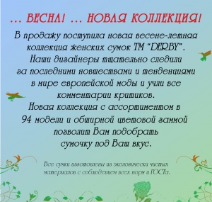 ![]() более подробней с ассортиментом новой коллекци ВЫ можете ознакомиться в раздели НОВИНКИ или в сети фирменных магазинов "DERBY" ![]() |