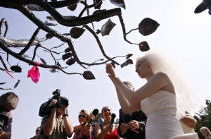 ![]() Ленточка — к счастливой жизни. Фото: С. Николаев В Наводницком парке, прямо у Ладьи, куда непременно заезжают свадебные кортежи, появилось кованое Дерево счастья с огромными металлическими яблоками. Легенда такова: если подержаться за листок и повесить на нем ленточку — брак будет долгим и счастливым. А если дотронуться до яблочка, которое висит на дереве, — дети будут здоровыми. ![]() Памятная плитка. Стоит 500 грн. Кроме того, каждая пара может заказать плитку со своими именами и датой свадьбы, на которой написано: «Спасибо, сердце, что ты умеешь так любить». Первопроходцами на Аллее молодоженов стали Михаил и Карина Мутьяновы. «Мы хотим, чтобы наши дети могли прийти сюда и увидеть наш камень на Аллее и ленточку», — сказали нам Мутьяновы. К вечеру Дерево счастья было обвешано массой лент, а вот когда появится следующая плитка на Аллее, неизвестно. За нее нужно платить «Киевзеленстрою» 500 гривен. Что будет с плитой, если брак распадется, пока не решили. Анастасия Браткова ![]() |